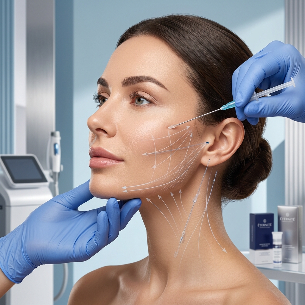 Threading requires precise anatomical knowledge. Incorrect placement can create visible dimpling, puckering, or asymmetry. At Éternité Medical Aesthetics & Longevity Centers, we use imaging and anatomical landmarks to ensure threads are placed along natural tension vectors, creating an imperceptible lift that looks entirely natural.