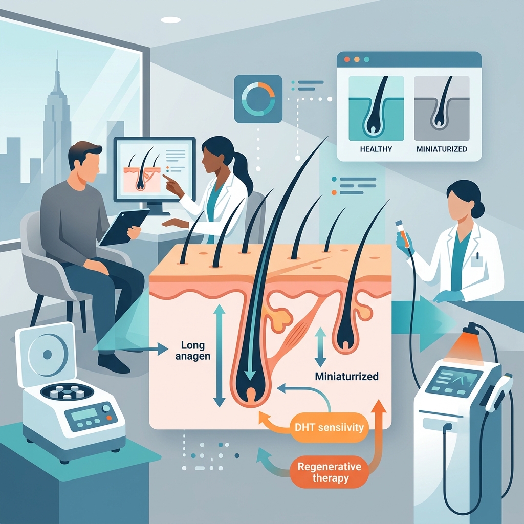 Pharmaceuticals like finasteride reduce DHT production, removing the hormonal signal driving miniaturization. When combined with regenerative therapies that simultaneously stimulate growth, the synergy often exceeds what either approach achieves alone.