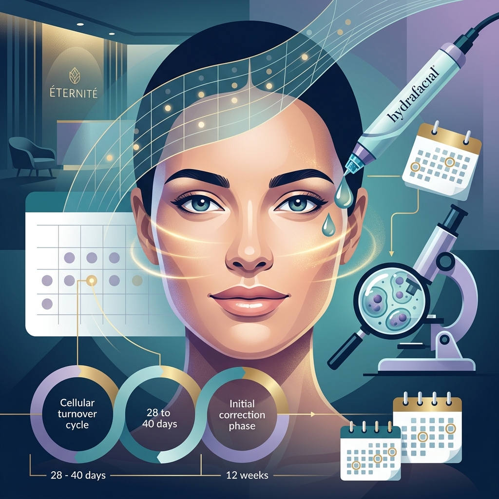 Cellular turnover cycle: Approximately 28 to 40 days under optimal conditions. This is why consistent treatments spaced four weeks apart align with your natural renewal rhythm.