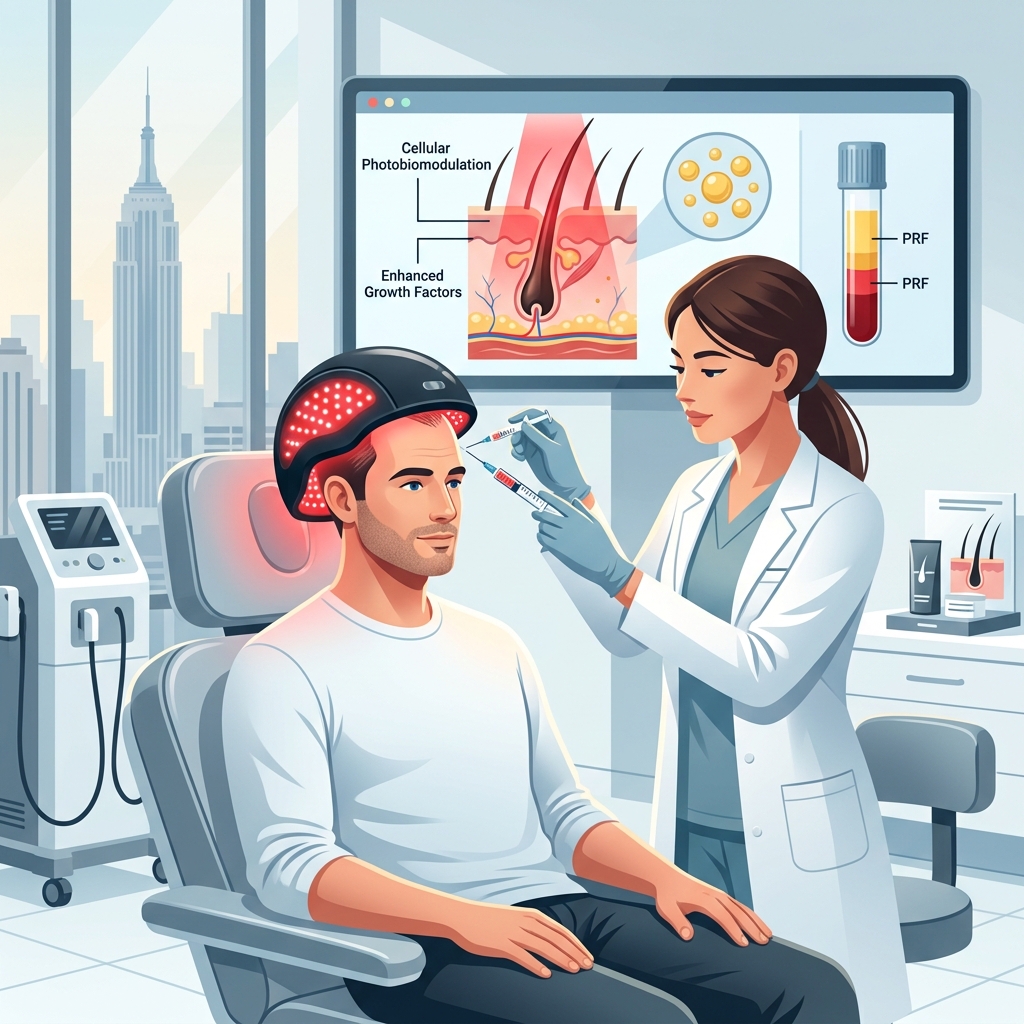 PRP (platelet-rich plasma) and PRF (platelet-rich fibrin) treatments concentrate growth factors directly into the scalp. When paired with laser stimulation, these biological agents and light energy create a powerful regenerative environment. We typically recommend quarterly PRP sessions alongside your laser cap regimen.