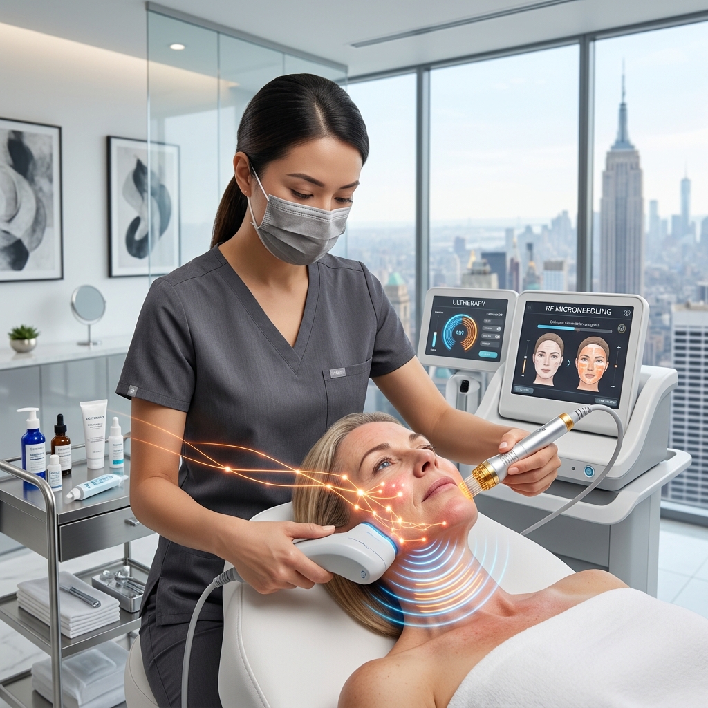 Ultherapy is one of the most extensively studied non-surgical lifting technologies available. It uses focused ultrasound energy to heat tissue at precise depths, triggering collagen contraction and remodeling without damaging the skin surface.